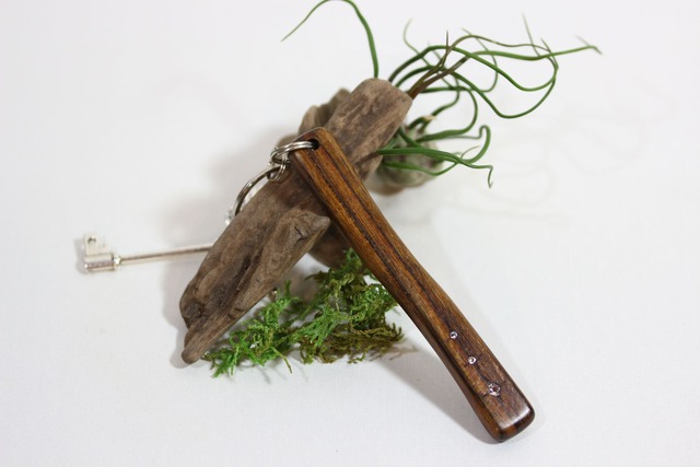Keyholder 【02series】 KH-206 ボコーテ ムラサキ科の南米材ボコーテを使用した木製キーホルダー シンプルに緩いカーブを描いたデザイン 表面にはスワロフスキー4㎜×1 2㎜×2を配置 握りやすい大きさで存在感があるのでバッグの中からも簡単に取り出せます ドイツ リボス社製オイルで磨き上げた手触りをお楽しみください 主材 【ボコーテ】 サイズ 縦11cm 横1.5cm 厚み0.7cm 重さ14g ※サイズは約で数ミリ誤差あります
