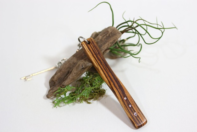 Keyholder 【02series】 KH-205 ゼブラウッド マメ科のアフリカ材ゼブラウッドを使用した木製キーホルダー シンプルに緩いカーブを描いたデザイン 表面にはスワロフスキー4㎜×1 2㎜×2を配置 握りやすい大きさで存在感があるのでバッグの中からも簡単に取り出せます ドイツ リボス社製オイルで磨き上げた手触りをお楽しみください 主材 【ゼブラウッド】 サイズ 縦11cm 横1.5cm 厚み0.7cm 重さ11g ※サイズは約で数ミリ誤差あります