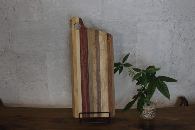 cuttingboard CT-007 元々ラックを作るために仕入れたシュリザクラでしたが 色合いのクセが好きでカッティングボードにしました ウエンジ黒いラインがワンポイントのシンプル仕上げ 木材保護のためにアーモンドオイル(食用)を塗布してあります。 ご使用の際は洗剤で一度洗ってから使用してください。 硬質化オイルではないので包丁の入りで木本来の肌を感じれれると思います。 ■主要材 シュリザクラ(朱里桜) ■使用材 ウエンジ ■寸法 ●最大長さ 約45.5cm(実効37cm) ●幅 約18.8cm ●厚さ 約1.5㎝ ●重さ 約660g ※多少誤差があります ■接ぎ合わせには米国食品安全基準をクリアした接着剤を使用しています □ 使用上の注意 □ ・直射日光が当たる場所での保管は避けてください。変形、干割れの恐れがあります ・長時間の水に浸かる環境も避けてください ・高温になる食洗器の使用も極力避けてください ・使用後は直射日光が当たらない場所で自然乾燥してください